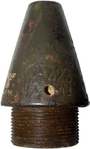 Ensuite poursuivons avec le reste d'une fusée d'obus allemand qui à fonctionné, visiblement une Kl AZ 23 composite en acier et plastique donc milieu ou fin de guerre: ( il semble apparaître des restes infimes de marquages mais ils sont très difficilement lisibles même au microscope) dimension du vestige Ø 45mm par 55mm de haut, modèle peut courant car à 5 éléments centrifuges comme pour les Az 23 et 23-28 alors que si vous observez bien sur le plan des Kl Az alu ( que vous pouvez voir ci-dessous ), cette fusée ne comporte normalement que 4 éléments.